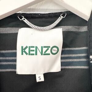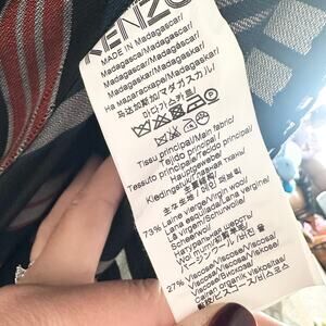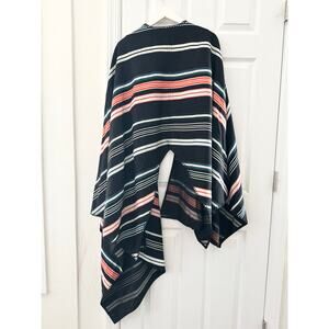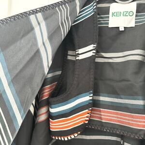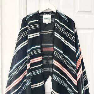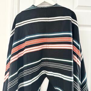 Size small from Kenzo. From RTW 2015 collection. Baja serape stripe style wrap cardigan poncho shawl. Built in vest like structure with shawl style wrap over it. Wool viscose blend. Black with orange blue and white and whipstitch edges. Preowned in excellent condition with no stains or tears.