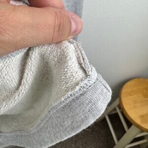 This was shortened from a dress to a tunic-length sweatshirt. The material & care tag has therefore been removed. Authentic, just altered.