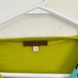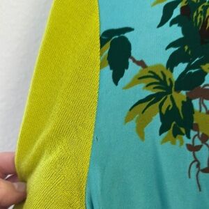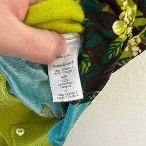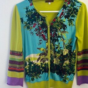 Vibrant floral cardigan and sleeveless top set. Features green, blue, and purple colors with intricate patterns.