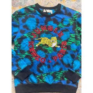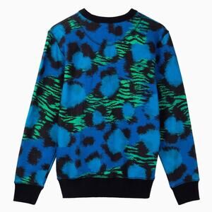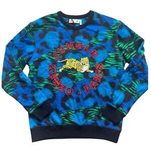 From the celebrated Kenzo x H&M collaboration, this bold sweatshirt captures the collection’s signature fusion of vibrant prints and playful streetwear energy. Featuring the classic Jungle Kenzo Paris embroidered logo with a leaping tiger motif, this piece showcases a vivid blue and green animal-inspired pattern contrasted by black ribbed trim.