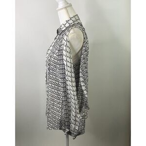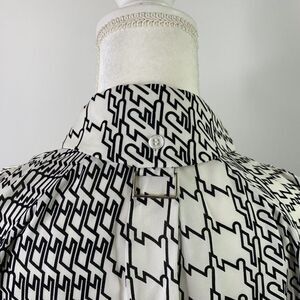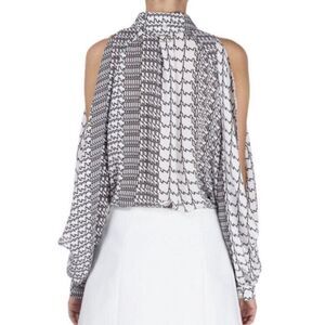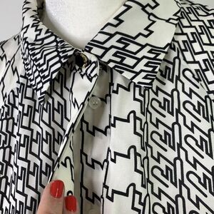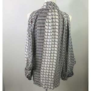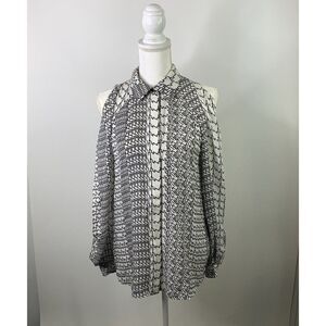 Kenzo Paris Women's Silk Shirt Sz 36 XS (see measurements below would definitely fit a s or m based on measurements) Black White Geometric Print Open Sleeve Cold Shoulder Long Sleeve Hidden Buttons Decorative Buttons Beautiful Quality Designer Made Button Front Shirt Collared