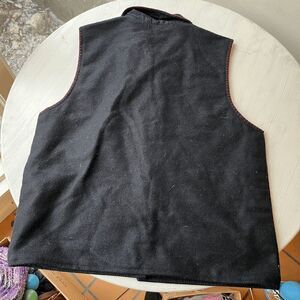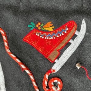 Celebrate the winter season with this festive Keren Hart holiday vest. Crafted from a wool blend (70% wool, 15% cotton, 15% acrylic) that feels like felt, this black vest features vibrant, intricately embroidered ice skates in red, blue, green, and yellow. The playful candy cane-inspired rope appliqués, jingle bell buttons, and red whipstitch trim make this piece a standout for holiday gatherings but it's not specific holiday vibes mean you can rock it all winter long. Fully lined with 100% cotton for comfort. Perfect for layering over turtlenecks or sweaters during festive occasions.