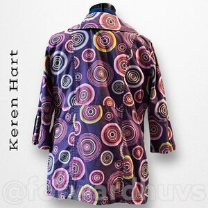 The Keren Hart purple hippy style blazer jacket in ladies size small is a unique and eye-catching piece. Its distinctive design combines elements of bohemian and retro aesthetics. The blazer features a vibrant purple color that adds a pop of excitement to any outfit.