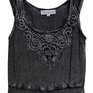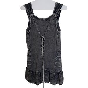 Features scoop neckline with embroidery & tiered layers at the bottom. Lace up design on the back. Mineral wash in black/dark charcoal grey hue. Sleeveless pullover design. Gently preworn. Size small. Approximate measurements lying flat: PTP: 15.5” L: 27” I welcome offers! Please message me prior to purchasing a bundle. #fairy #hippie #boho #laceup #festival