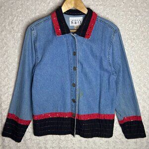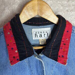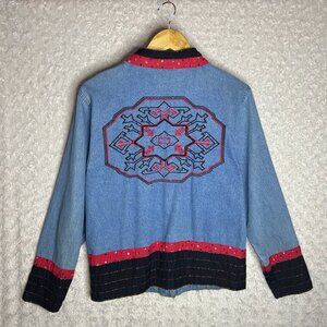 Keren Hart Tantrum Blues Inspired Jean Jacket Size Small Southwest / Western / Aztec Lightweight Embellished Denim Button Down Collared Jacket with Sequins 100% Cotton Blue Black Red. Garment is in very nice overall condition. Looks new or rarely and lightly worn. No rips, no stains, no snags, no pilling, no sacking out of the fabric (or elastic or leather) Noted. Open to reasonable offers.
