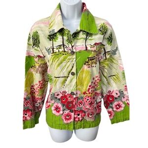 This Keren Hart button-up jacket exudes stylish charm with its floral print and subtle sequins. Crafted in India from 100% cotton, it's a versatile piece for any wardrobe. Note: A few sequins are missing, but overall esthetics remain intact.