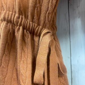 Golden brown, mock neck, cinch and tie waist, lettuce hem, dolman sleeves, ribbed trim, wide cuffs, soft, colors may vary due to lighting, good used condition, M/L