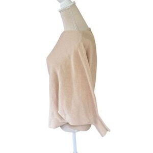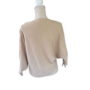 Boat neck top with 3/4 length Dolman sleeves and Curved sweep in fine Rib stitch.