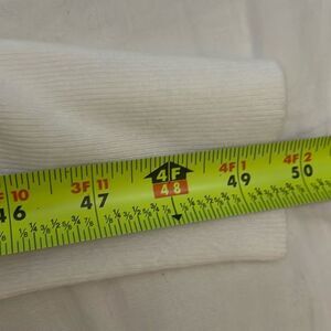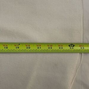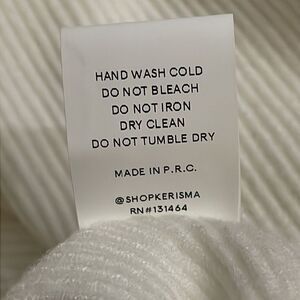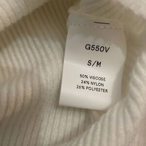 Ryu, white, 50% viscose, 24% nylon, 26% polyester, soft, knit, pullover sweater with dolman sleeves by Kerisma in a women's size small/medium. Style# G550V. Deep V-neck. Horizontal rib knit. Curved hemline. Hand washable. Approximate measurements shown in photos. In great pre-owned condition.