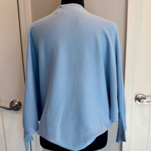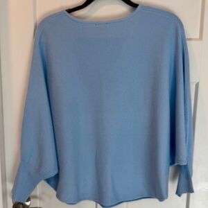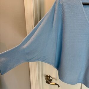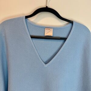 Kerisma long sleeve sweater, Size S/M, Light blue with V neck. Soft comfy sweater with dolman sleeves and V neck. Rouched at bottom for flattering fit at waist. 50% viscose, 24% nylon, 26% polyester.