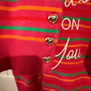 Very cute XOKR sweater in size Medium. Striped and says "Next Smile's On You" on the back. Features gold heart-shaped buttons on cuffs.