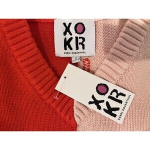 New with Tag, Anthropologie Brand Kerri Rosenthal women's Red & Pale Pink Radiant Heart Colorblock V-Neck Oversized Pullover Sweater, size Small, cotton blend chunky knit, crew neck, ribbed neckline/cuffs/hem, long Dolman sleeves, 3-inch side vent slit at hemline, relaxed fit. Measurements when laid flat unstretched: 24 inches from armpit to armpit, 23 inches from mid-back neck to hem edge, and 20 inches from dropped shoulder seam to cuff edge.