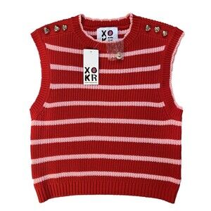 New with Tag, Kerri Rosenthal women's Red & Pink Striped Cotton Blend Chunky Knit Back Heart Applique Cropped Sweater Vest, crew neck, ribbed scalloped edges at neckline & armpit, shiny silver button accents at shoulders, yellow embroidered heart applique at back, ribbed hemline.