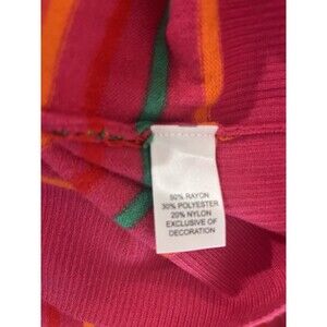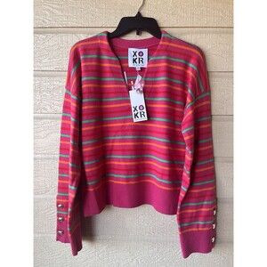 New with Tag, Anthropologie Brand Kerri Rosenthal women's Hot Pink with Red/Green/Orange Stripes NEXT SMILE'S ON YOU Super Soft Knit Pullover Sweater, size XS, V-Neck, white embroidery on back, long Dolman sleeve with 3 silver heart buttons at cuff, ribbed cuffs & hem, relaxed fit.