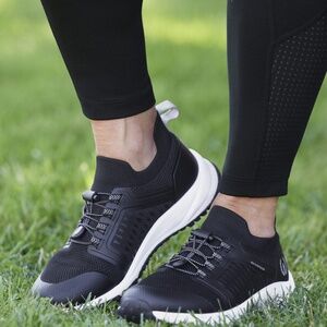 The perfect equestrian waterproof sneaker. Go from street to stable in a waterproof sneaker that's perfect for the barn. From dewy morning course walks to after-lesson lattes, this high-contrast shoe steps in when you need a break from boots. Sporty and street smart, with a hay-shielding sock top, the pull-on design is made for equestrians on the move. Waterproof fabric upper vents vapor while protecting you on rainy-day dashes. Adjustable laces secure and stretch, and a removable, anti-microbial insole keep feet feeling fresh. K-Stride™ midsole supports and stabilizes, while the lightweight yet durable OrangeZone™ Lite outsole provides just the right amount of traction.