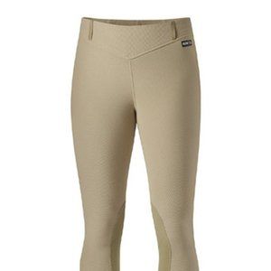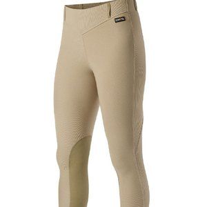 From daily rides to show time, the elegant Kerrits Ladies Microcord Knee Patch Tights have got you covered. These women’s riding tights will work double time, boosting performance and confidence with four-way stretch fabric. Not only does this allow for optimal movement while riding but also compresses muscles to reduce fatigue. Finished with a non-stretch v-panel to create a flattering silhouette as well as suede knee patches for additional stability in the saddle. Tan.