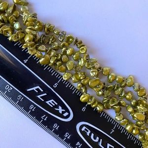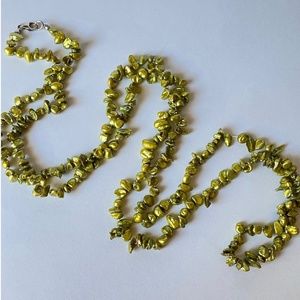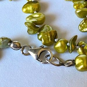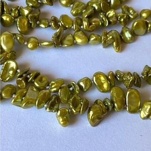 Pistachio in color. 44” length. Can be worn double or triple layered. Sterling silver lobster clasp.