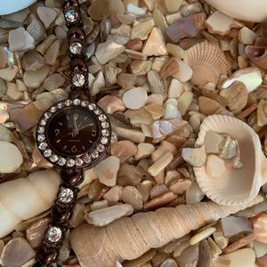 Diamond accent at 12. quartz movement new battery installed 7/31/21. Dark metallic bronze case and bracelet accented with clear crystals on the bexel and bracelet. EUC like new. overall length 8" and can be adjusted down by removing the extra clasp. face is 1" wide.