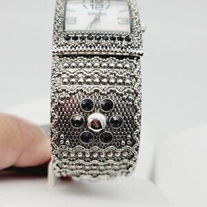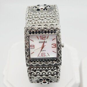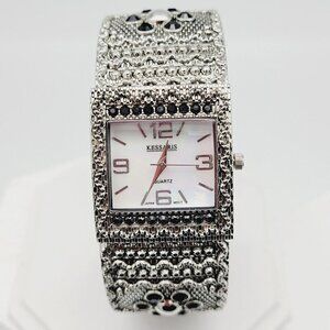 Kessaris Ladies Open Cuff Watch & Hinged Oval Bracelet Set MOP Face Silver Tone