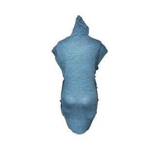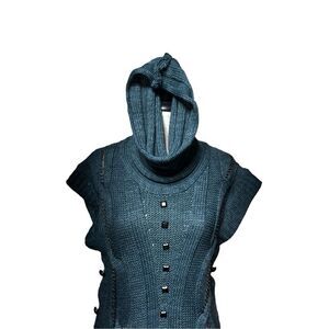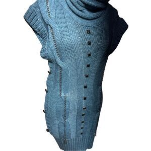 Made of 35% wool and 65% acrylic. Features a fully embellished front, silver hardware, and tall cowl neck. Laying flat measures 19" from pit to pit, and 33" shoulder to the hem could be worn as a mini dress.