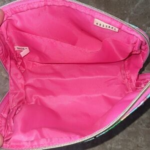 Colorful cosmetic bag with flamingo and fruit print. Perfect for travel or daily use.
