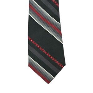 This sleek necktie features a sharp striped pattern in black, gray, and red tones, suited for professional or formal occasions. Its durable polyester material ensures long-lasting wear while maintaining a polished appearance.