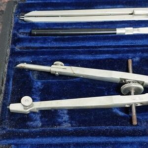 This vintage K. and E. drafting set seems complete and in its original hard shell case. It measures 11" x 5". This was and is, top of the line.