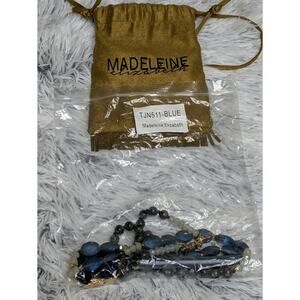White, grey and blue beaded statement pendant necklace with a gold lined geode slice and blue colored tassel. Madeleine Elizabeth jewelry bag included.