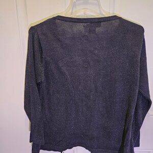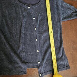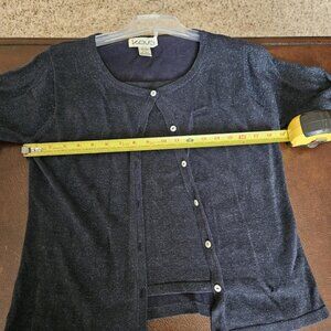 Kevo, silk blend cardigan, metallic shimmer, navy sweater, built-in tank, button front, women’s size L, layered look, lightweight knit, elegant casual