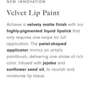 Dare to paint your lips whatever color your inner artist desires with Velvet Lip Paint. This lightweight, comfortable liquid matte lip color locks in vibrant color for long wear, while the transformative texture saturates lips with bold color and sets a velvety matte finish. The petal-shaped applicator mimics an artist's paint brush to deliver one-stroke color, while the precision tip helps to define and create your look.