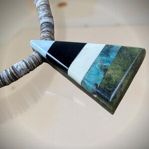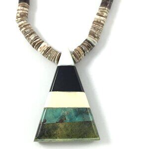 Hand-cut shell heishi strand with a graphic inlay tab pendant (white shell, black jet/onyx, cream shell, turquoise, green serpentine/green jasper). Classic Kewa/Santo Domingo aesthetic; clean triangular geometry; great everyday piece.