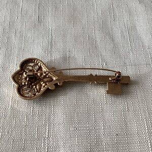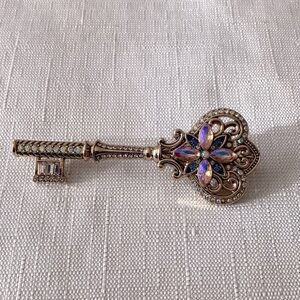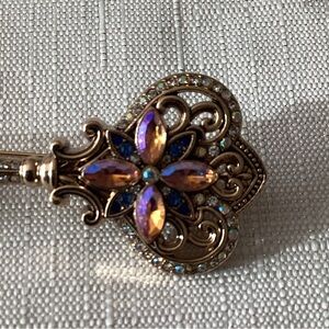 Key brooch in gold tone features rhinestone, aurora borealis in the shape of a flower. There are blue rhinestones in between the petals. The top of the key is so pretty and intricate.