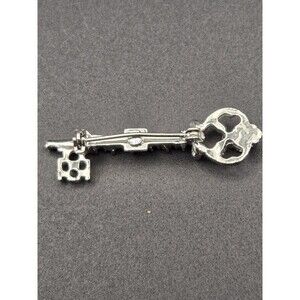 This key brooch pin features a vintage design with blue crystal rhinestones set in silver tone metal. The 2" size makes it a statement piece for fashion jewelry, adding a touch of elegance to any outfit. The intricate detailing and use of rhinestones give it a luxurious look, perfect for those who appreciate vintage charm and timeless style.