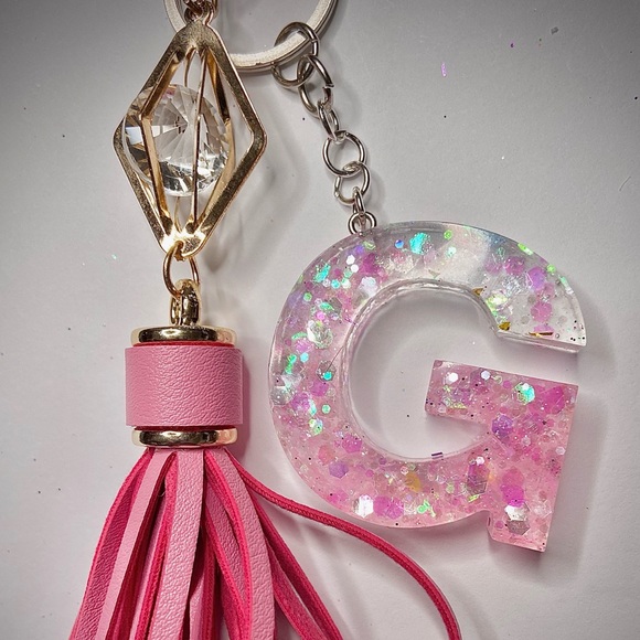 Letter G keychain with pink tassel. I make the letters out of epoxy and glitter