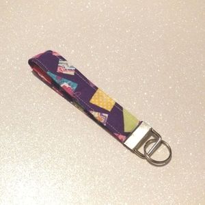 Handmade key fob with purple print. Silver hardware, length approximately 6". Made with cotton fabric.