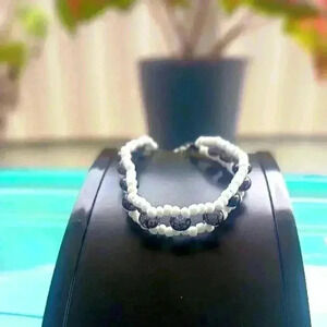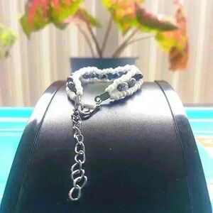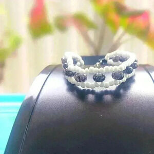 key largo handmade beaded black and white elastic bracelet measures 6.75 inches with a 2 inch extension chain and fir with a lobster claw clasp.