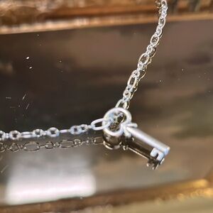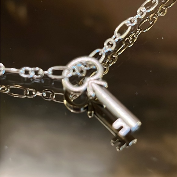 Beautiful silver plated chain measures approximately 18 inches. Charm is a beautiful silver tone key pendant that measures approximately 3/4 inches in length and 1/4 inches across. It is new, but come without tags in a little pouch.