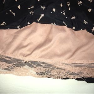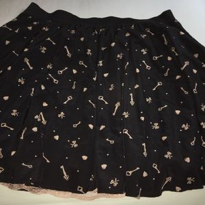 Pretty flouncing patterned skirt. The pattern is keys and hearts. Pretty lace along the edge. Comfy elastic waistband. Comes down to mid thigh. Perfect condition.