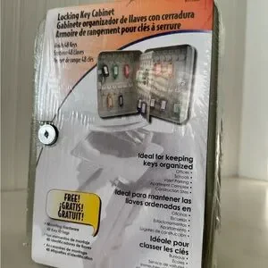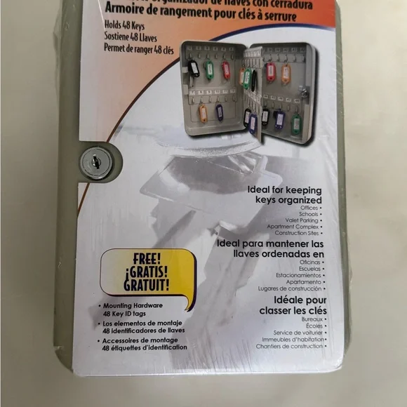 Secure key storage box with lock. Holds 48 keys. Includes key tags in various colors.