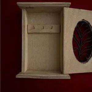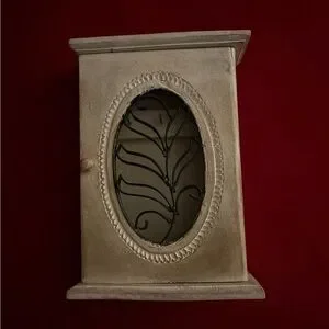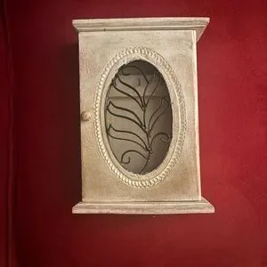 Elegant cream wooden wall cabinet featuring intricate black ironwork on the door. Perfect for adding a touch of sophistication to any room. Approximately 6 x 8 inches
