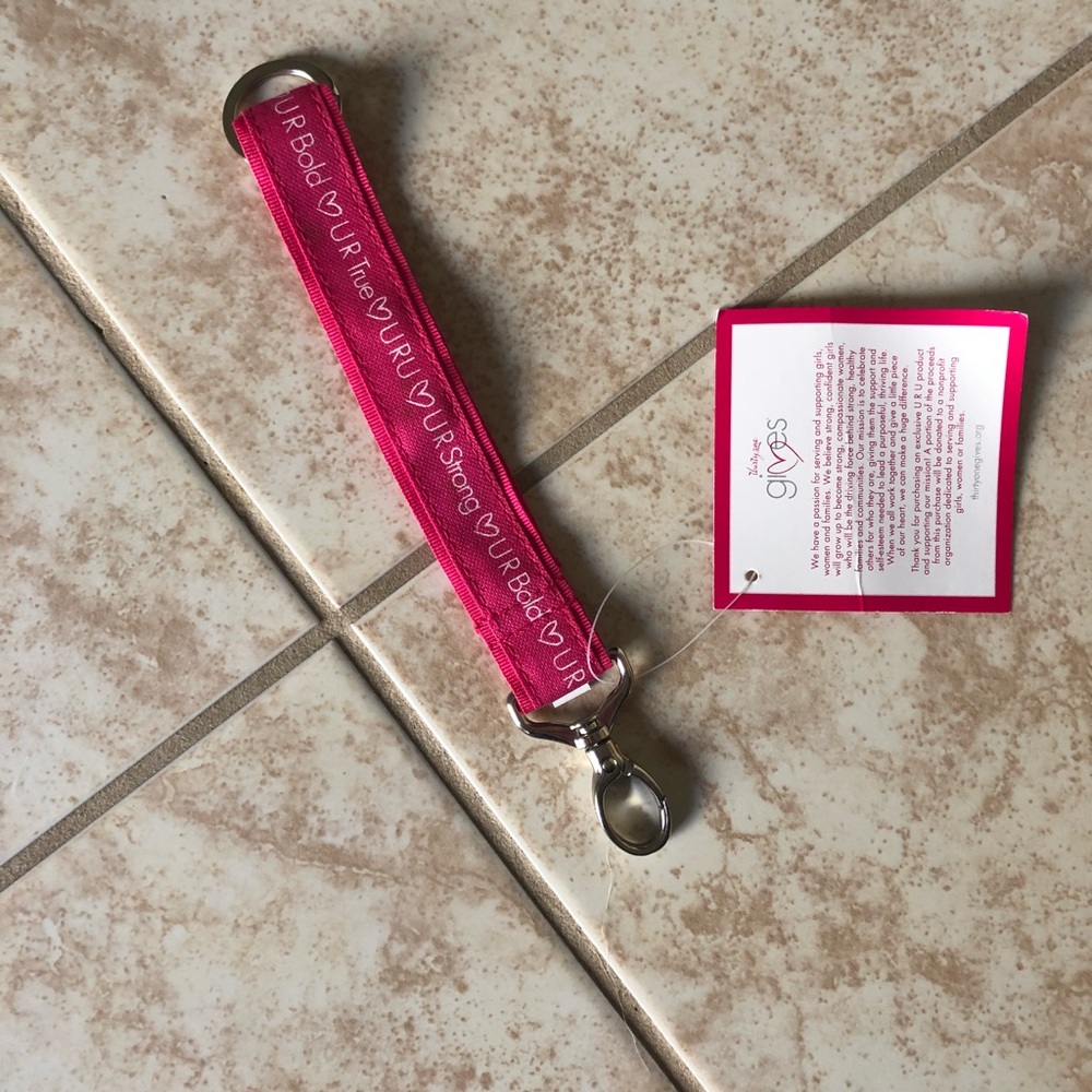 Thirty-one pink key chain. One end has a ring and the other has a clasp. The pink part is large enough to wrap around your wrist.
