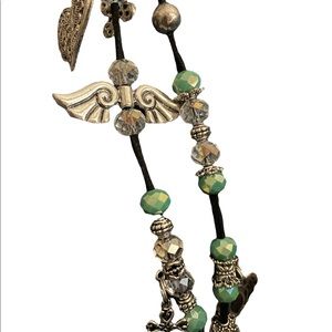 This is a 9” key chain with beads and charms on a black cord.