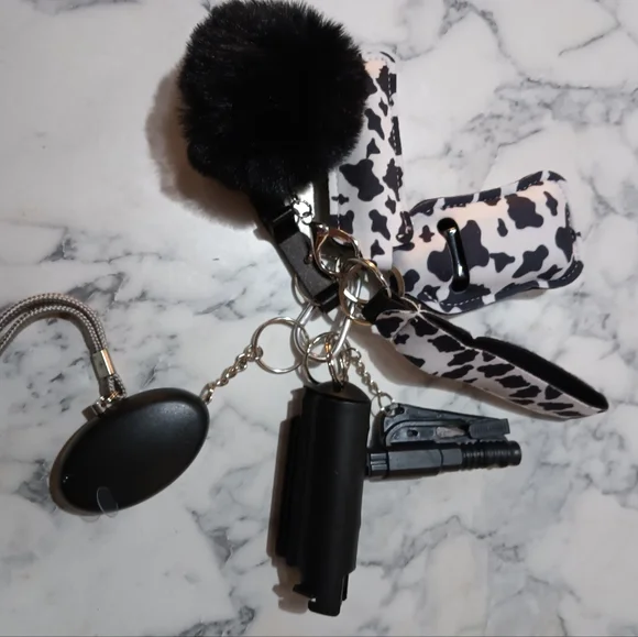 cow print keychain with bunch of goodies for the ladies