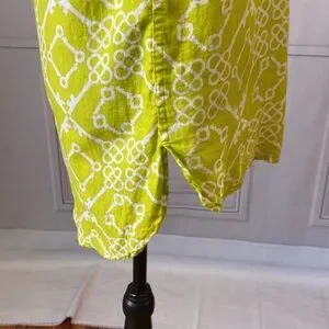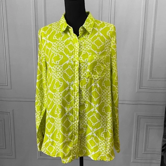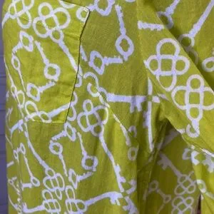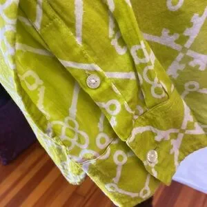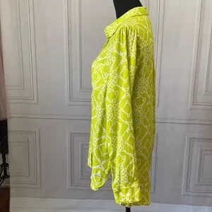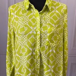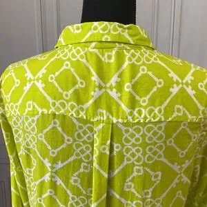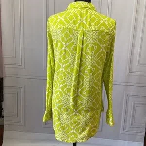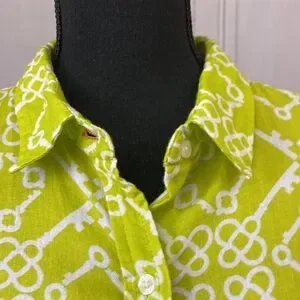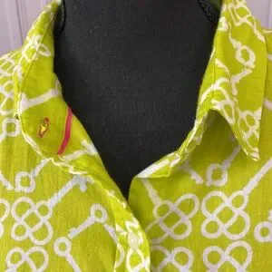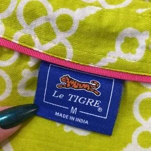 Le Tigre Size medium 100% cotton button down shirt Hilow ham lime green with white key print super soft embroidered lion by the front ham made in India good preowned condition please see pictures