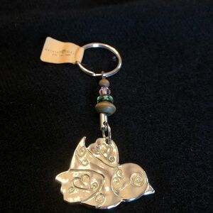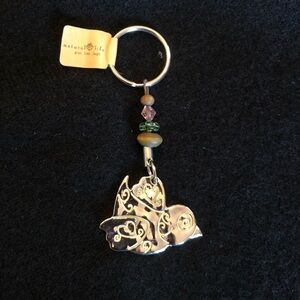 Beautiful bohemian key ring by Natural Life. Bird with decorative hearts and swirls on one side, imprinted with “life is good” on the back. Two wooden beads and two plastic ones.
