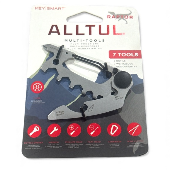 KeySmart AllTul Raptor multi-tool with 7 functions. Features a sleek silver design.