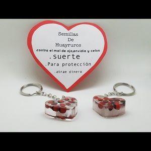 Handmade Huayruro Seed key chain. The red and black seeds are said to bring good fortune and abundance while warding off negative energy. The Huayruro seed is native to Peru and has been an important part of Peruvian culture for centuries.