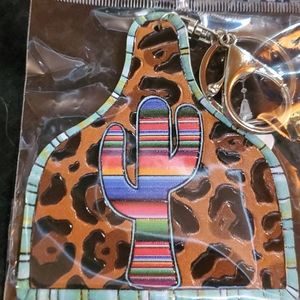 Serape cactus and leopard keychain, ear tag shape, brand new