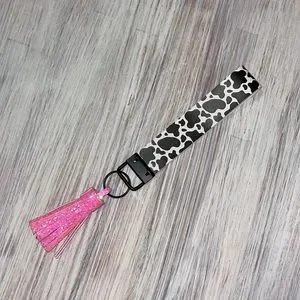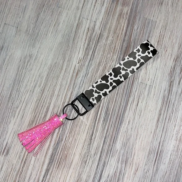 Keychain with cow print and a sparkly pink tassel. Never been used