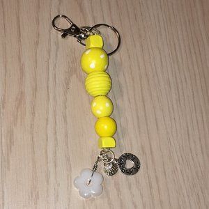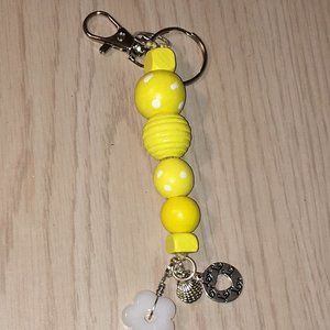 Yellow/white dotted wooden beads with Love/Shell/Flower charm dangles.